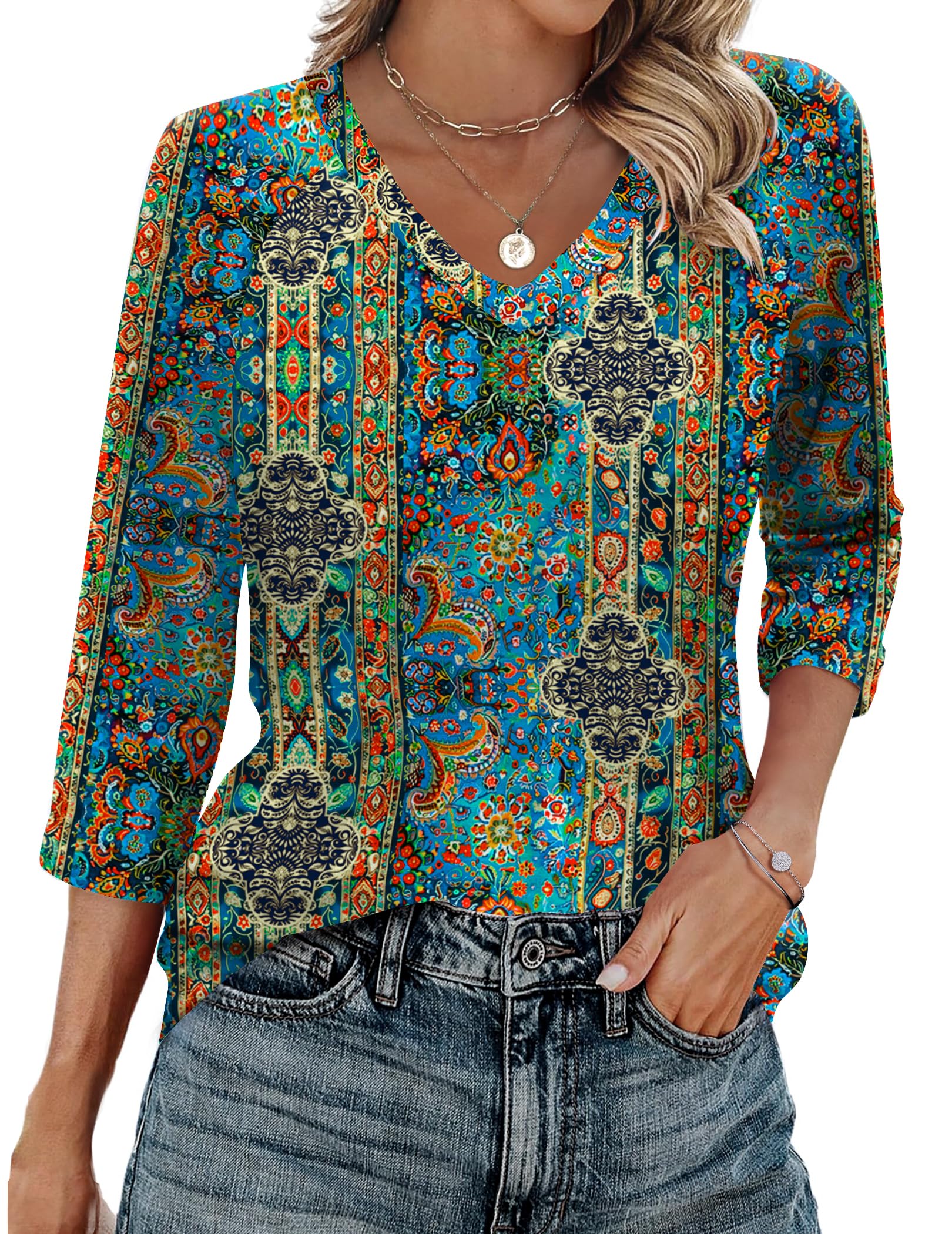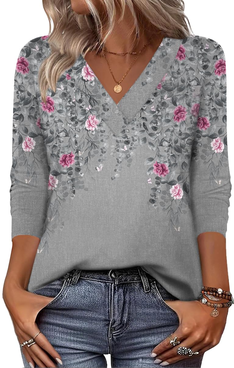 3/4 Length Sleeve Womens Tops Casual V Neck Shirts Soft Basi...