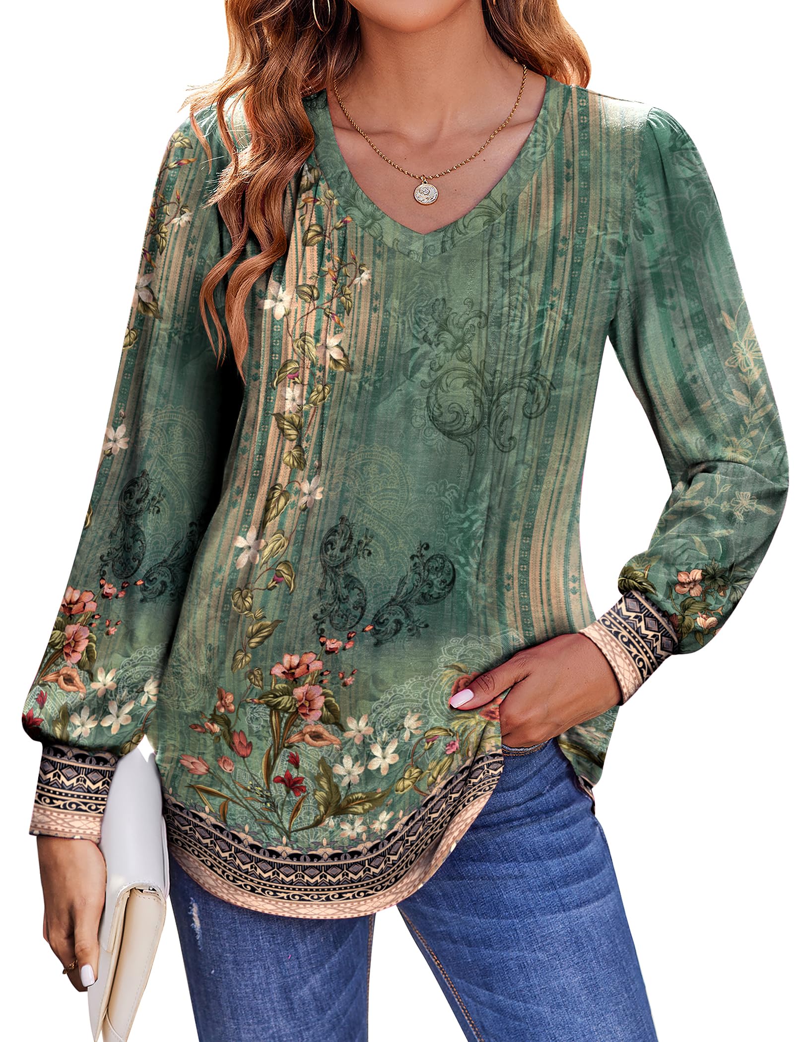 Women's Puff Long Sleeve Shirts Pleated V Neck Fall Tunic To...