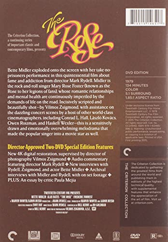 Bette Midler exploded onto the screen with her take-no-prisoners performance in this quintessential film about fame and addiction from director Mark Rydell (On Golden Pond). Midler is the rock-and-roll singer Mary Rose Foster (known as the Rose to her legions of fans), whose romantic relationships and mental health are continuously imperiled by the demands of life on the road. Incisively scripted by Bo Goldman (One Flew Over the Cuckoo's Nest) and beautifully shot by Blow Out's Vilmos Zsigmond (with assistance on the dazzling concert scenes by a host of other world-class cinematographers, including Conrad L. Hall, Laszlo Kovacs, Owen Roizman, and Haskell Wexler), this is a sensitively drawn and emotionally overwhelming melodrama that made the popular singer into a movie star as well.