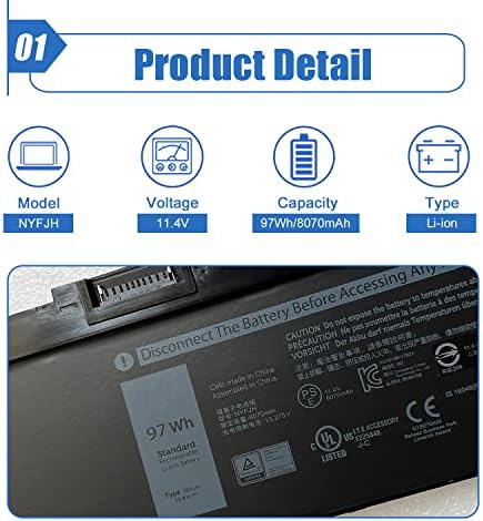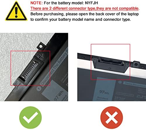 - 👍👍【Dell Authentic OEM Parts】Item Model: NYFJH; Battery Type: Li-ion; Voltage: 11.4V; Capacity: 97Wh/8070mAh; Battery Color: Black. 【Note】There are two kinds of connectors for NYFJH battery, please make sure your original battery is the same as the picture before placing order.