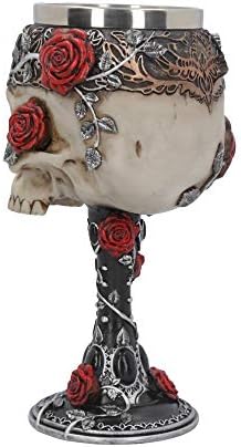 This product is for ornamental use. Raise a toast to the reaper with the enchantingly haunting Gothic roses goblet, available to Nemesis Now. The Black stem and base of this goblet is bordered with silver trim, red roses blooming from silver vines. The silver tendrils creep around the skull that forms the body of the goblet, roses adorning the cheek and temples. Their brow is covered in Black, A golden filigree pattern reminiscent of a regal tiara. Cast in the finest resin before being expertly hand-painted, this exquisite goblet comes with a removable stainless steel insert for ease of cleaning.