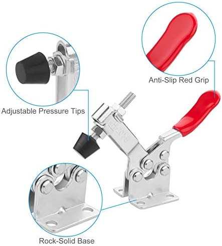 - Premium Material: These hold down clamps woodworking set are cold-rolled carbon steel with zinc plated coating for corrosion resistance. The toggle clamps woodworking set have a oil and stain resistant red vinyl hand grip