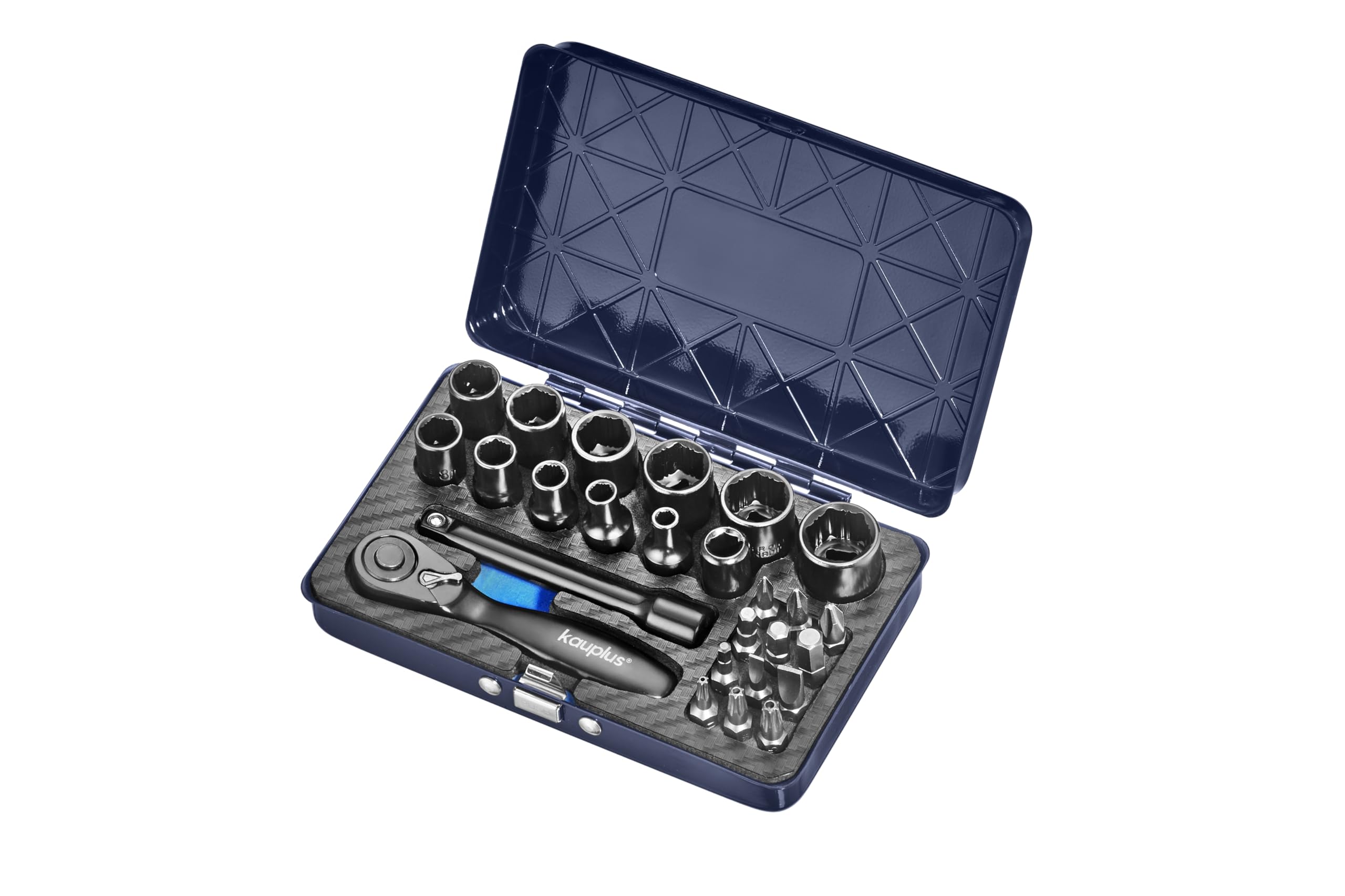 The Kauplus 1/2-Inch Drive Deep Thin Wall Flip Socket Set, offer 2 hex sizes in one socket for removal of 8 different tire lug nut sizes quickly. Chromium Molybdenum steel drop forge constructed Flip Impact Socket Set, with rust-resistant black phosphate finish for lasting lifetime. Set contain: 17mm x 19 mm, 21 mm x 7/8”(22 mm), 3/4" x 13/16", 7/8" x 15/16" and a 3" extension bar. Thin Wall dual-end deep flip socket, allows access to reach the space where is limited. Made in Taiwan, come with a storage blow case. Caution: Always wear safety goggles for prevent any personal injury or properly damage.