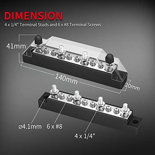 - Terminals: Each battery distribution block includes - M6 terminal studs x 4 and M4 screw terminals x 6, suitable for 1/4" and #8 insulation ring terminals.
