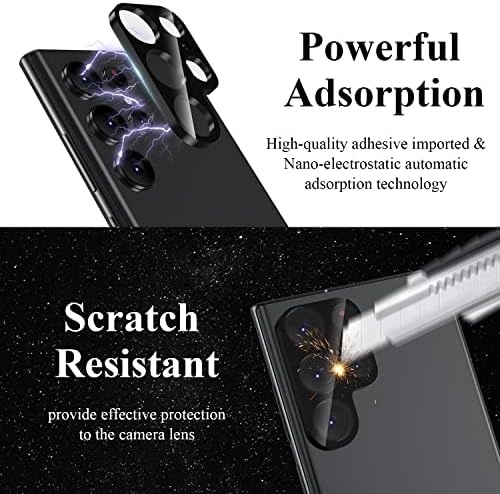 - 【Full Coverage Protection】Precise laser cutting size provides maximum protection and double secure for the entire camera lens of your Samsung Galaxy S22 Ultra, 9H Glass camera protector effectively protects the entire camera lens from drops, scratches and abrasions. The oleophobic layer prevents dust and fingerprints, which can keep your phone lens clear and clean all day long.
