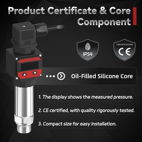- Premium Quality: Enclosure Protection: IP54. The shell of our digital pressure transmitter is made of stainless steel, safe to use, excellent performance and durable. Digital display and press button control; Vibration and shock resistance; Equipped with Reverse polarity protection; Strong overload and a anti-environmental interference, good stability.
