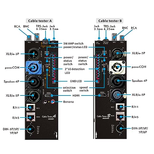- Allowing you to evaluate a large variety of cables with ease,such as RJ45, RJ11,HDMI, Speakon, XLR, RCA Phono, BNC, DIN, TRS, DMX and Banana