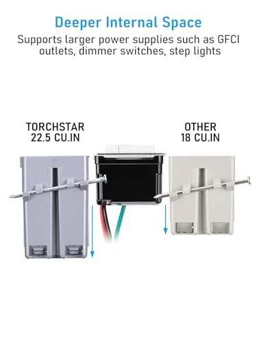 - 22.5 CU.IN: The deeper internal space of 22.5 cubic inches accommodates products with larger power compartments such as GFCI outlets, dimmer switches, and step lights, providing ample space for wiring. In addition, the built-in cable clamps securely hold the wires in place