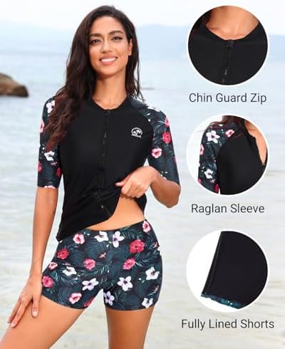 Holipick Women 2 Piece Rash Guard Swimsuit-Short Sleeve Swim Shirt with Shorts Full Zipper SPF Modest Swimwear