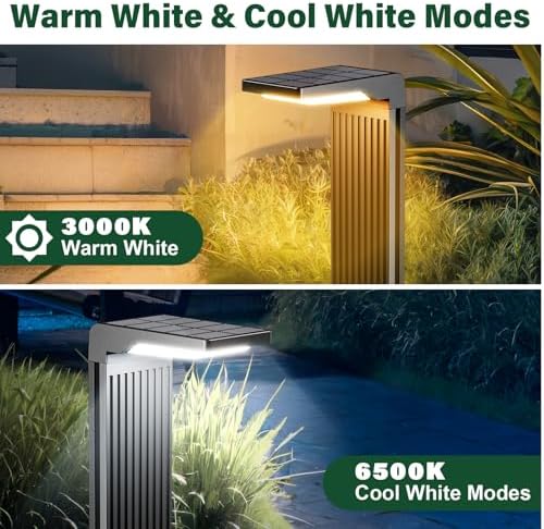 - 【4 Modes and 2 Color in 1】: This solar sidewalk lights provide 4 modes including high brightness warm light, middle brightness warm light, high brightness cool white light and middle brightness cool white lights for your needs. And also 3000K/6500K color temperatures to match with other lights in your garden. The upgraded COXSENI solar path light more brighten but not blinding. Choose energy mode for long lasting and better for second day.