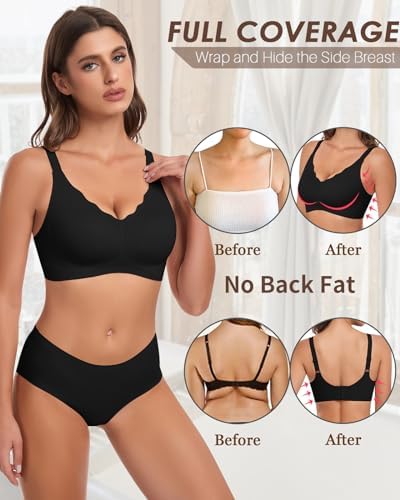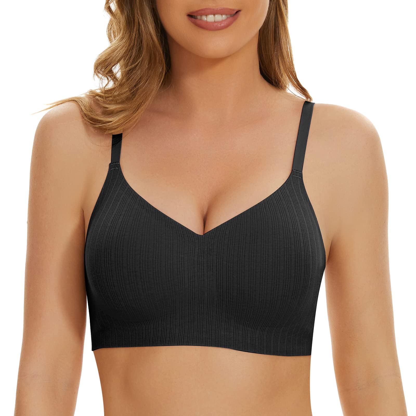 WOWENY Wireless Bras for Women No Underwire Seamless Bra Wavy Full Coverage Wide Strap V Neck Bralette Padded Push Up