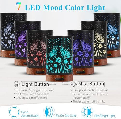 - 4-IN-1 MULTI-FUNCTIONAL ESSENTIAL OIL DIFFUSER: Can be used as an oil diffuser, cold mist humidifier, color-changing night light, and is also a beautiful room decoration. Essential Oil Diffuser adopts a unique butterfly design, which creates an aesthetically pleasing and peaceful atmosphere under the light, and is ideal for purifying the air, humidifying the air, moisturizing the skin, and relieving stress. A great gift for friends and family on birthdays, Mother's Day