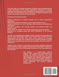 - This book offers an in-depth exploration of Klipper macro programming and G-code optimization for 3D printing applications. Designed for students, engineers, and enthusiasts with a foundational understanding of 3D printing principles, this guide delves into the intricacies of Klipper's powerful macro system and advanced printer control techniques.Key features of this book include:Detailed explanations of Klipper firmware and its macro programming capabilitiesStep-by-step tutorials on creating and optimizing complex macrosAdvanced techniques for error handling, safety features, and performance optimizationIntegration strategies with external systems like OctoPrint, MQTT, and custom scriptsBest practices for modular macro design, debugging, and documentationExploration of emerging trends and future possibilities in 3D printing firmwareThrough nine comprehensive chapters, readers will gain the knowledge and skills to create sophisticated, efficient, and reliable macro systems for their Klipper-based 3D printers. From basic macro structures to advanced optimization techniques, this textbook covers everything needed to master Klipper macro programming and push the boundaries of what's possible in 3D printing.Whether you're looking to streamline your printing workflow, implement custom features, or gain a deeper understanding of 3D printer firmware, this book provides the tools and knowledge to take your 3D printing expertise to the next level.