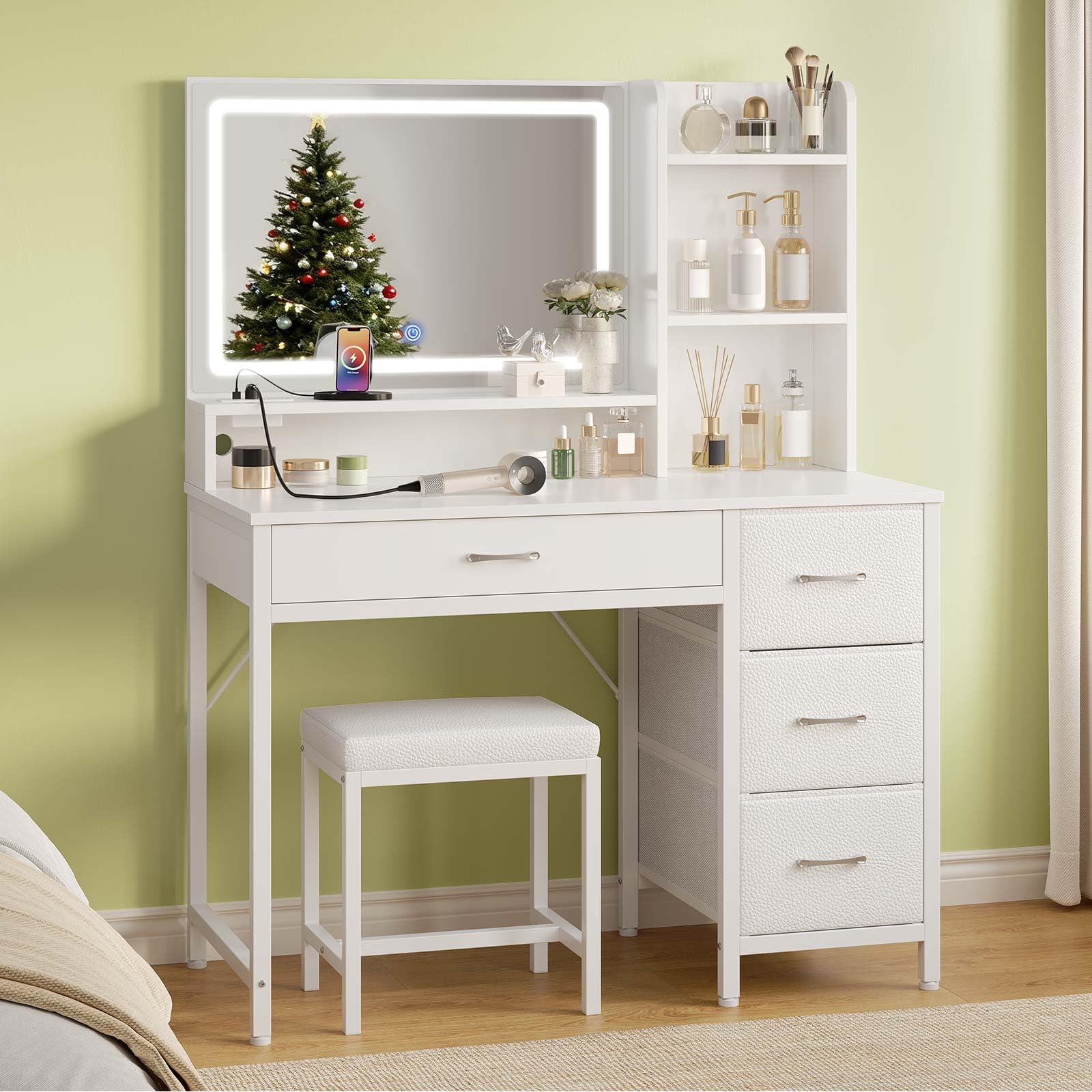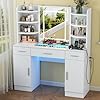 - 【Vanity Desk with Lighted Mirror】This makeup vanity comes with lighted mirror with adjustable brightness in three lighting modes (cold white, warm white and warm yellow). You can touch to switch the color and long press to adjust the brightness of the light, providing perfect illumination for your makeup routine, meeting your needs in different environments and helping you create the perfect makeup easily. Enjoy the flawless makeup environment with this white vanity.