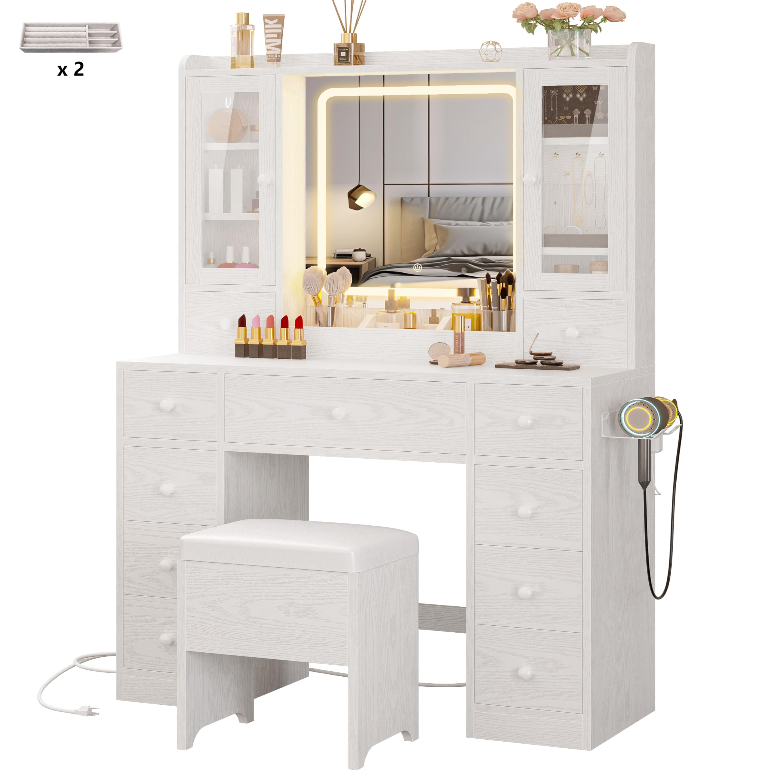 - 【Convenient Charging Station】This modern makeup desk comes with 2 AC outlets and 2 USB ports on the right side, which is a thoughtful and convenient design. After applying your makeup, you can use your hair dryer or curling iron more conveniently, as well as charge your devices or use other electronic devices more easily without any hassle. Whether it's your smartphone, tablet, smartwatch or hair dryers, you can ensure they're always charged and ready to go. The perfect combination of style and practicality, this dresser is a great addition to bedrooms, dressing rooms, makeup rooms, and other spaces.