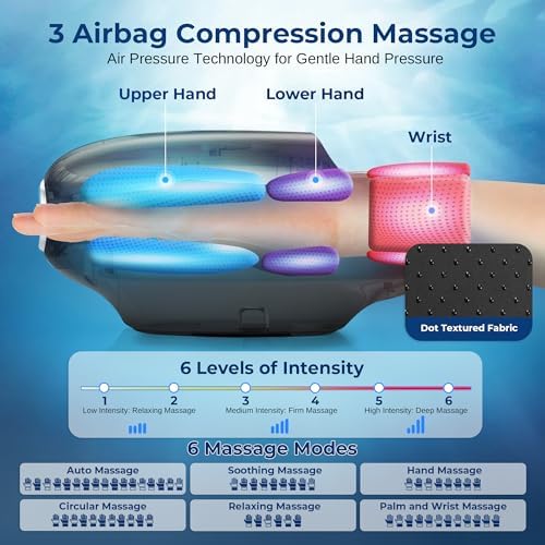 - 6 MASSAGE MODES AND 6 INTENSITY LEVELS – Enjoy a fully customizable massage with 6 unique modes and 6 intensity settings, combining air compression, kneading, and soothing heat for the ultimate hand relaxation experience