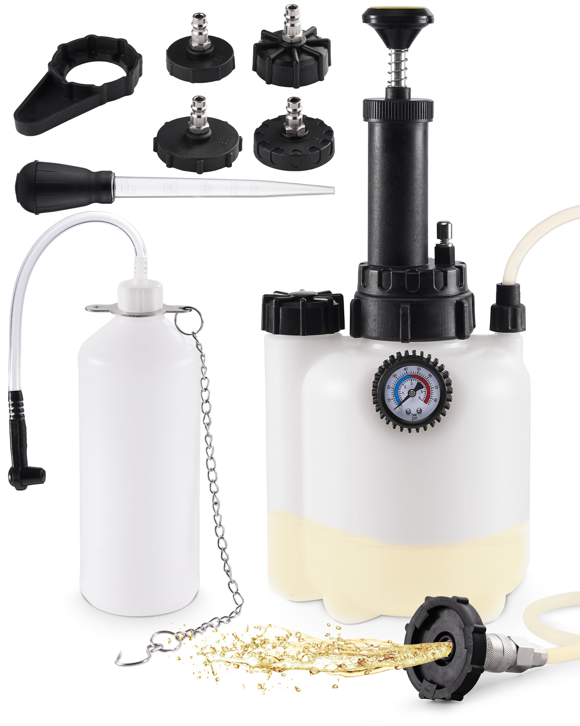 - 【User-Friendly & Safe Design】 Designed for single-person use, the bleeder kit comes with an easy-to-read pressure gauge to monitor the system and a hanging chain for hands-free operation. Upgraded cap structure helps reduce the risk of leaks during pressurization