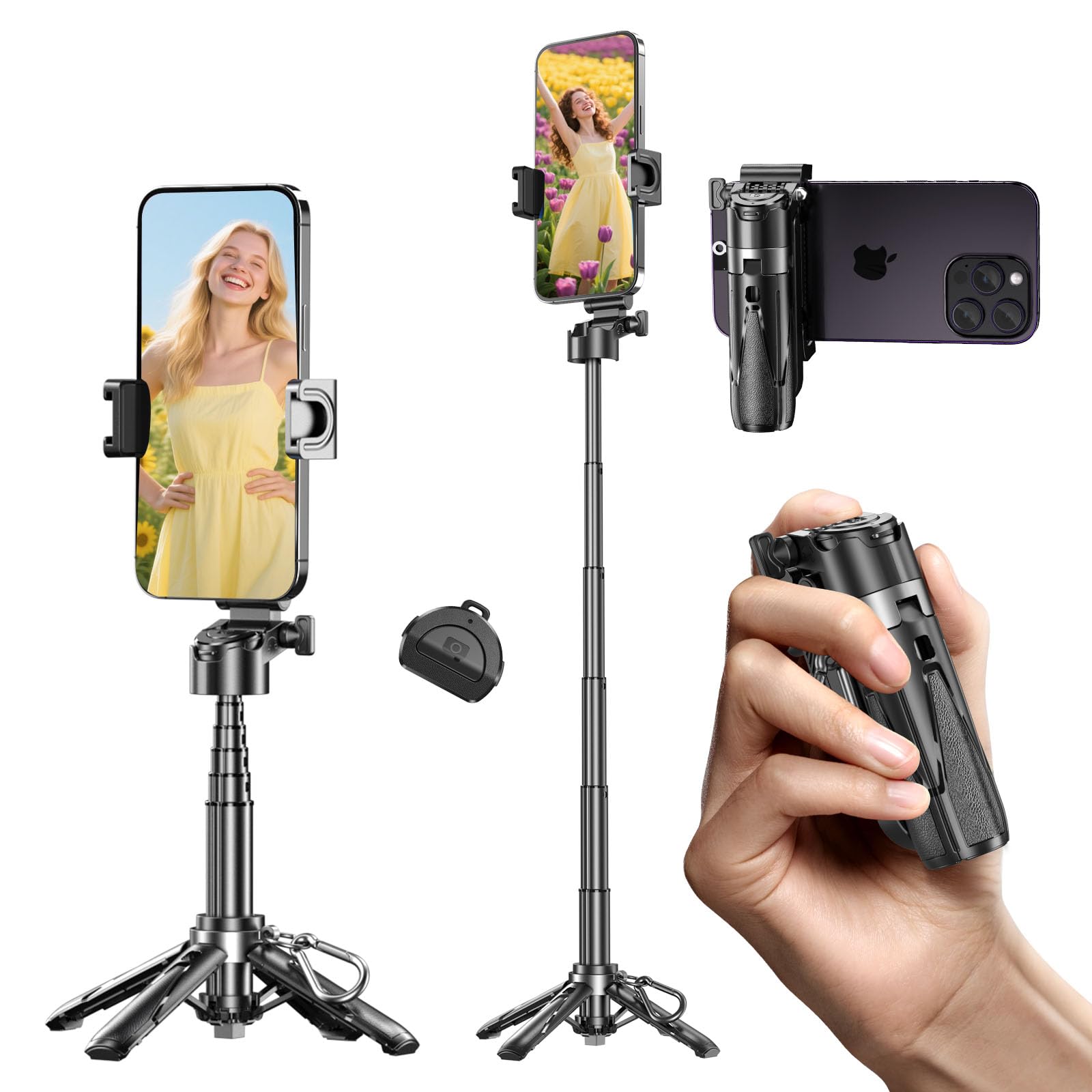- 【Mini 3-in-1 Mobile Tripod】This newly designed 3-in-1 phone tripod integrates a tripod, selfie stick and phone holder into one. Featuring a compact telescopic design, it measures just 4.6 inches when folded—ultra-portable and perfectly fits all 4 to 7-inch iOS/Android phones.