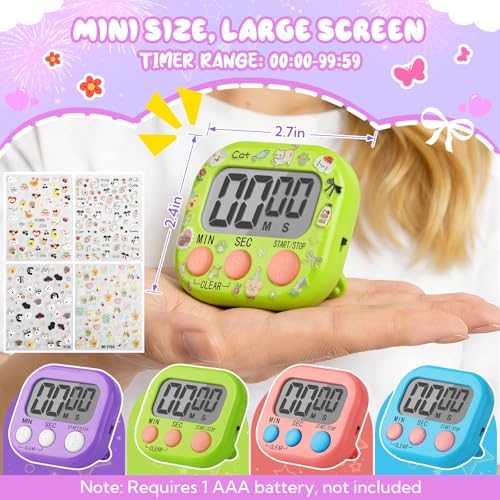 - DURABLE: Each timer measures approximately 2.4 by 2.7 inches, making it compact and available in a variety of colors and quantities to meet your various timing needs. Powered by one AAA battery (not included), it can be switched on/off to conserve power when not in use. NOTE: When the timer display becomes unclear or the sound becomes weak, replace the AAA batteries