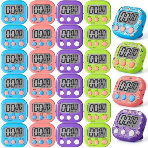 - MULTIFUNCTIONAL TIMER: This 24-piece digital kitchen timer comes with a large display, memory function and up/down mode timing function (00:00–99:59), the alarm buzzer will emit a loud beep in a large space, allowing you to hear it clearly in another room, it is an ideal time management tool for cooking, beauty, studying, exercising, etc